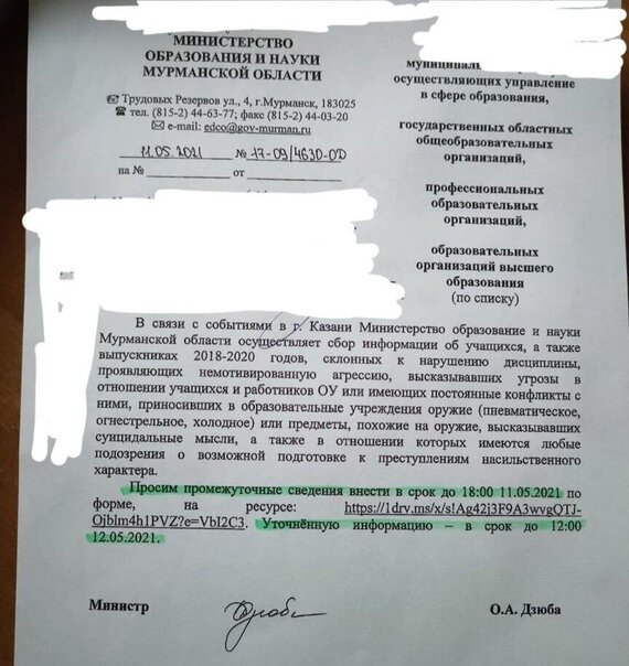После стрельбы в Казани мурманским школам поручили создать список "склонных к нарушению дисциплины" учеников. Среди причин включения - "свободолюбие" и участие в протестах за Навального. Министерство образования Мурманской области потребовало создать базу учащихся и выпускников 2018-2020 годов, склонных к нарушению дисциплины, проявлявших или проявляющих "немотивированную агрессию", имевших или имеющих постоянные конфликты с учениками или учителями, когда-либо приносивших в школу оружие, высказывавших суицидальные мысли, а также подозреваемых "в возможной подготовке к преступлениям насильственного характера". Сведения об учениках попросили внести в документ: прикреплённая ведомством ссылка вела на форму Microsoft Excel - в течение нескольких часов она находилась в открытом доступе (сейчас доступ к документу закрыт). В таблице были указаны имена, фамилии, даты рождения, номера телефонов, сведения о родителях и прочая информация о "подозрительных" учащихся. Среди отрицательных характер