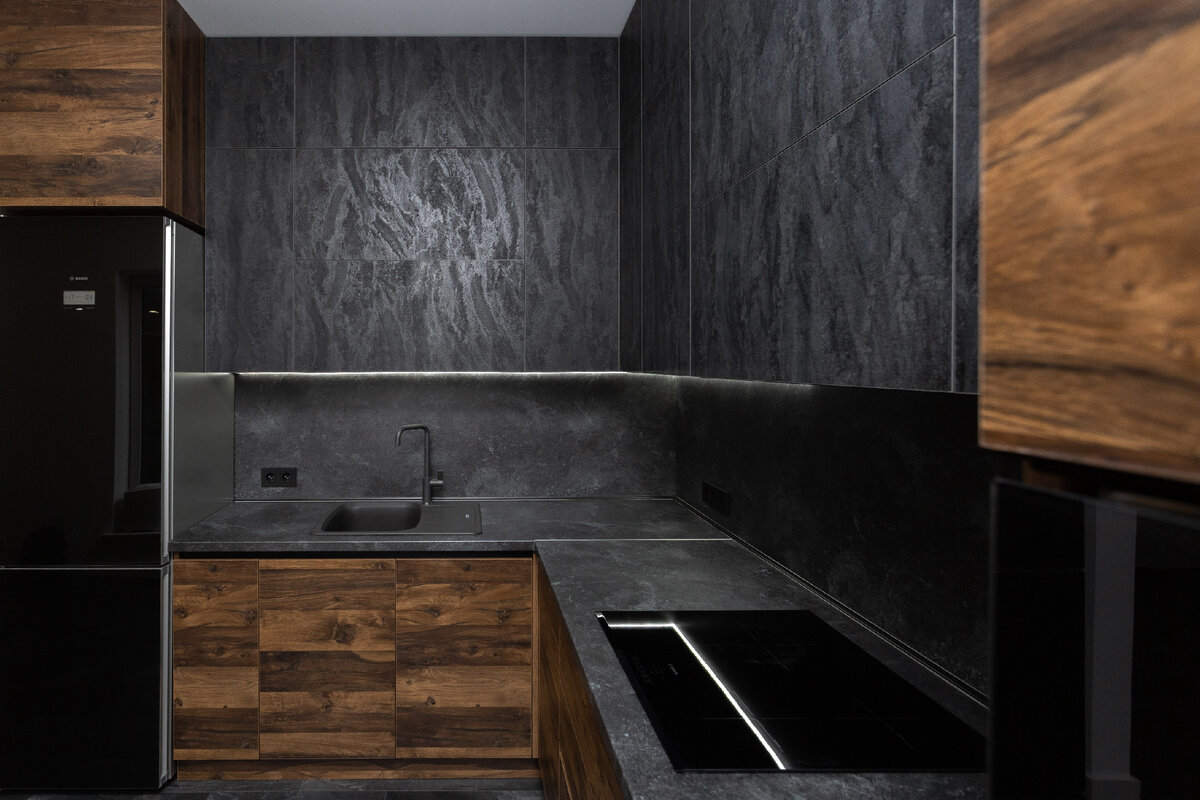 Считается, что черная кухня – это кухня с мужским характером, основательная, сдержанная, брутальная. Но это не совсем так, такая кухня может быть роскошна, элегантна и утонченна. Ведь темный цвет используется не только в индустриальном и ультра современном стиле, но еще и в ар-деко и классике. Для многих современных дизайнеров работать с черным интерьером одно удовольствие. Ведь при грамотном дизайне можно создать по-настоящему уникальный и роскошный интерьер. Советы по дизайну и оформлению черной кухни: 5. В черной кухне необходимо избегать перегруженности декором и деталями, иначе интерьер будет казаться перегруженным и безвкусным. 6. Известно, что темные кухни самые маркие. Надолго сохранить презентабельный вид интерьера позволит тщательный уход за кухней. 7. Черный цвет «умеет» корректировать пространство. При правильно расположении цветов помещение можно расширить или сузить, а также визуально отрегулировать высоту потолков. 8. Черный пол – смотрится шикарно, если подобрать фак