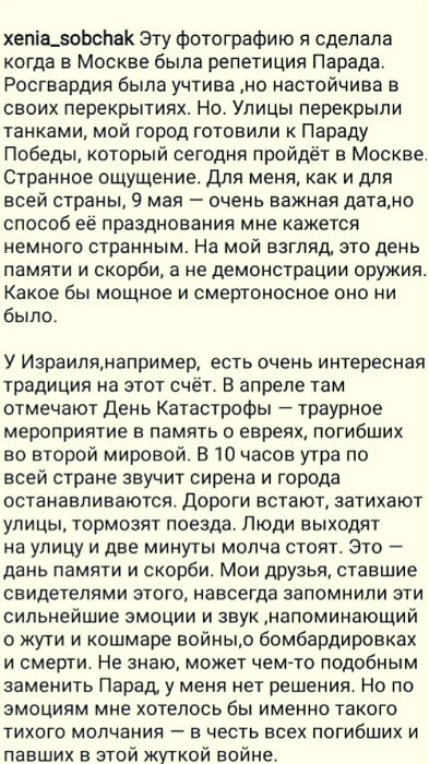 Совсем недавно - 3 дня назад праздновался день Победы в городах России, парад и другие, поднимающие боевой дух жителей события. Несомненно очень важная дата, которая навсегда в сердцах у истинных Россиян и Патриотов. Но, давайте вместе посмотрим на фотографию, и на то, что написана Ксения Собчак в своем посте в инстаграме. Что бы это могло значить? Что вы думаете по этому поводу? Я лично считаю, что это неправильно. Потому что в 1945 году, когда наконец снялся этот мрак и страх с жителей нашей страны, именно тогда СССР доказал всему миру, что не нужно на него нападать, потому что наши люди будут драться до самого конца. А парад как никогда поднимает боевой дух не только каждого отдельно взятого человека, но и всех людей в целом. Так что я считаю, что менять ничего не нужно. А вот, что на это ответил Максим Галкин. Посмотрите сами: А с кем согласны вы? Я однозначно с Максимом, потому что он - адекватный и взрослый, здравомыслящий человек. А вот Ксения мне меньше симпатизирует. На эт