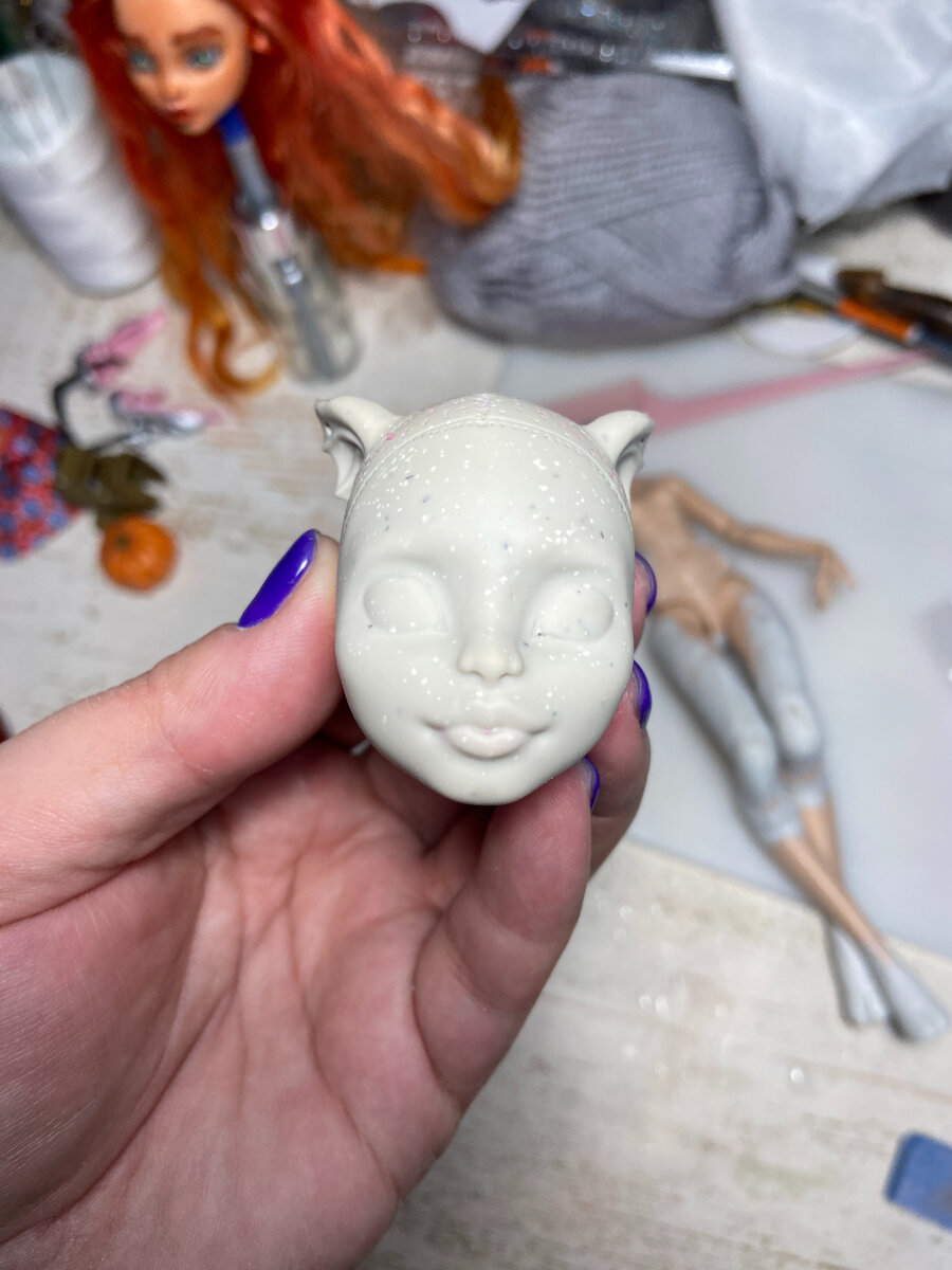 Привет, мой любопытный читатель. Меня зовут Ирина и я делаю оригинальных кукол на базе кукол Монстр Хай. Продолжу рассказ о том, как я делаю Фавна. Все предыдущие статьи по созданию этого персонажа: Мой новый интересный проект: кукла Фавн. Фавн. Работа над головой и создание рожек. Шерстяные ножки и наряд для Фавна. После всех манипуляций с лицом у меня получилось вот такое чистое и светлое лицо. Кукольная голова была прошита натуральными локонами козы некрашеными, естественного цвета и с естественной волнистостью. А так же на голову были замонтированы рожки и покрашены. Я попробовала покрыть все личико акрилом, но мне результат не очень понравился. Я смыла этот слой акрила и разница между цветом тела куклы Эвер Афтер Хай и головой Рошель становится очень заметной: Лицо Рошель имеет пятнистый рисунок, напоминающий камень, и серый оттенок. Специально для этого проекта я купила Пан Пастель: Для моего Фавна идеально подходит нежный розовый оттенок. Поэтому я укрываю прическу и рож