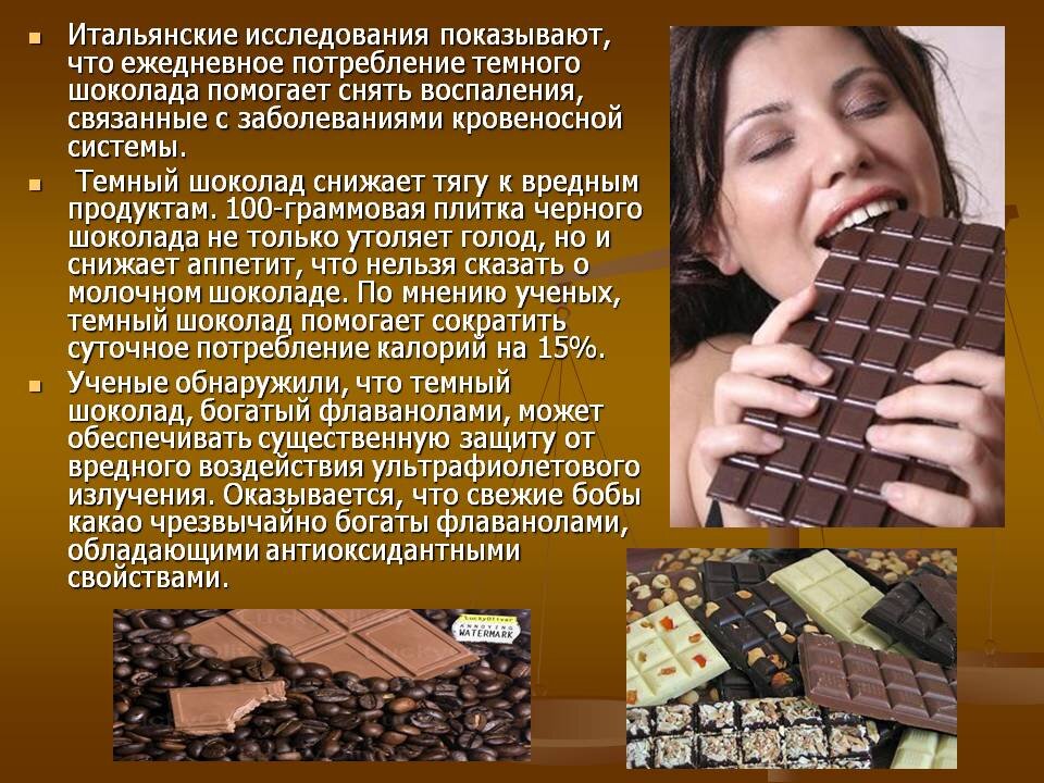 Шоколад поднимает настроение и общее самочувствие Вкус, запах и текстура шоколада благоприятно влияют на области головного мозга. Шоколад также содержит триптофан — незаменимую аминокислоту, которая стимулирует выработку серотонина, естественного антидепрессанта. Эксперты приравнивают чувства, которые он вызывает, к тем, которые мы испытываем в период влюбленности. Не зря мы заедаем стресс шоколадом — это естественная реакция организма для получения необходимого вещества в экстренной ситуации. 2. Шоколад поддерживает здоровье сердечно-сосудистой системы Употребление шоколада может снизить кровяное давление, уменьшить риск появления инсульта и оказывать противовоспалительное действие. Сейтанна Купер говорит, что это связано с высоким содержанием в шоколаде химических веществ, называемых флавоноидами.