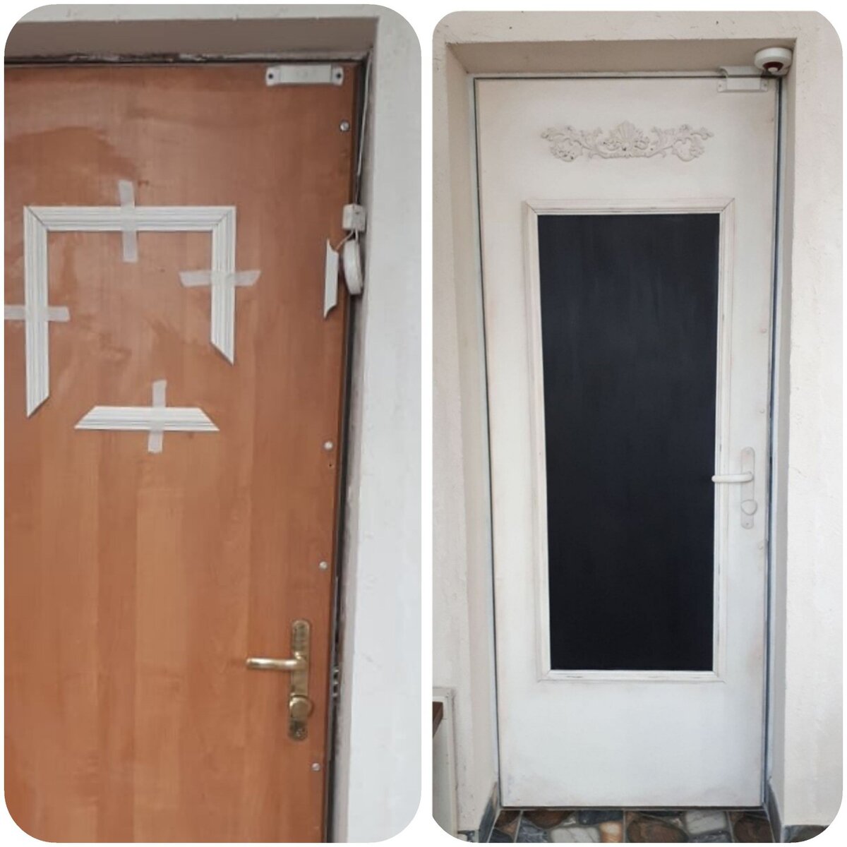 У многих из нас есть двери, которые раздражают своим видом или никак не вписываются в интерьер. Хочется пойти и купить новые. Но замена дверей это же целая эпопея. Представили? Да ужас как не хочется с этим связываться! И дорого к тому же. Что делать? Предлагаю вооружиться красками, инструментами и перекрасить, чтобы радовали глаз и идеально вписались в стиль вашего жилища. Это гораздо дешевле и проще, чем кажется. Для начала несколько фото дверей, что перекрашивала я и мои заказчицы. Моя дверь в студии преобразилась так: Покрасила я ее меловой краской Энни Слоан цвет "Старый белый", украсила объемным декором и молдингами из строительного магазина. В центре грифельно-магнитная поверхность. Для защиты выбрала прозрачный воск и нанесла немного темного воска по краям и в углубления для состаривания и выделения объема. Идеи для своей двери подсмотрела на Pinterest: А