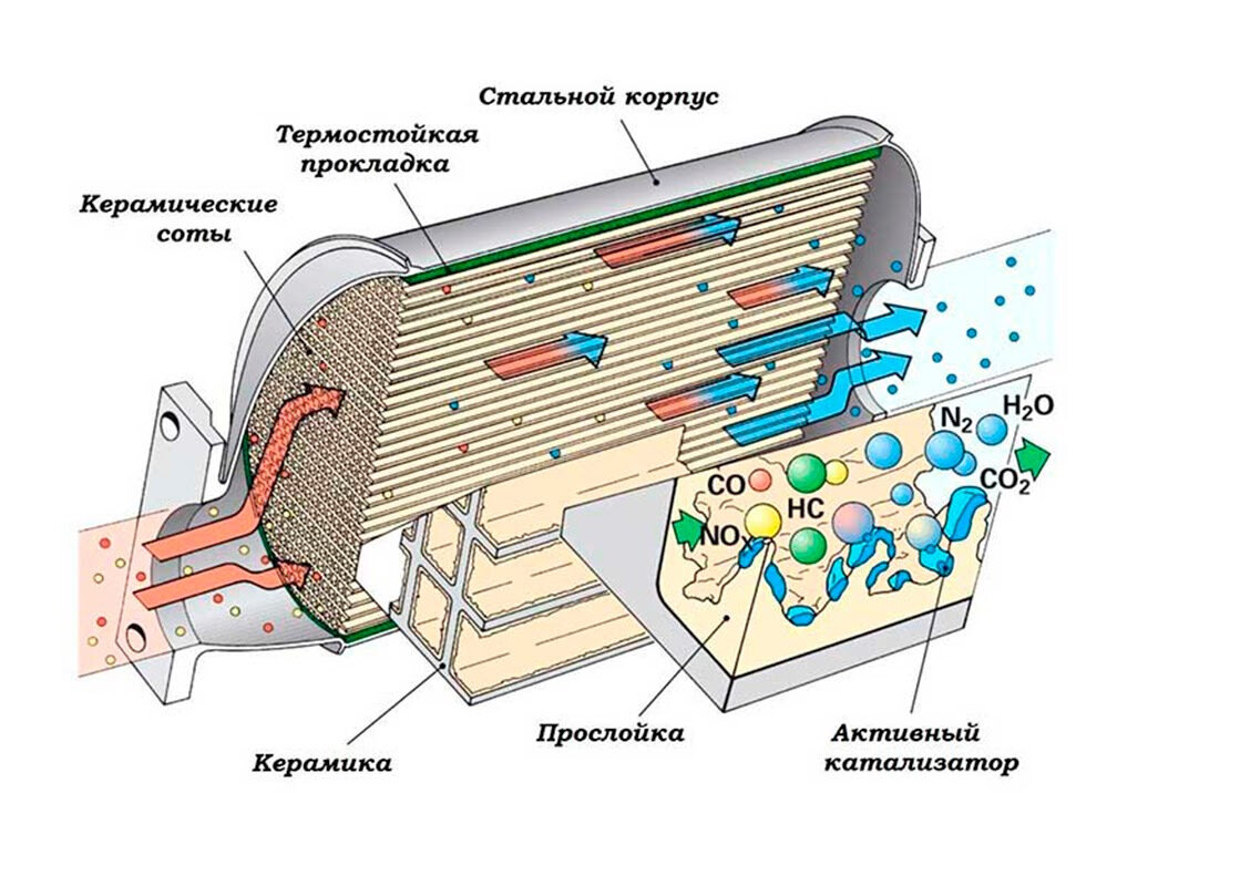 Чтобы понять, как нейтрализатор уменьшает вредные выбросы, рассмотрим более детально его строение.