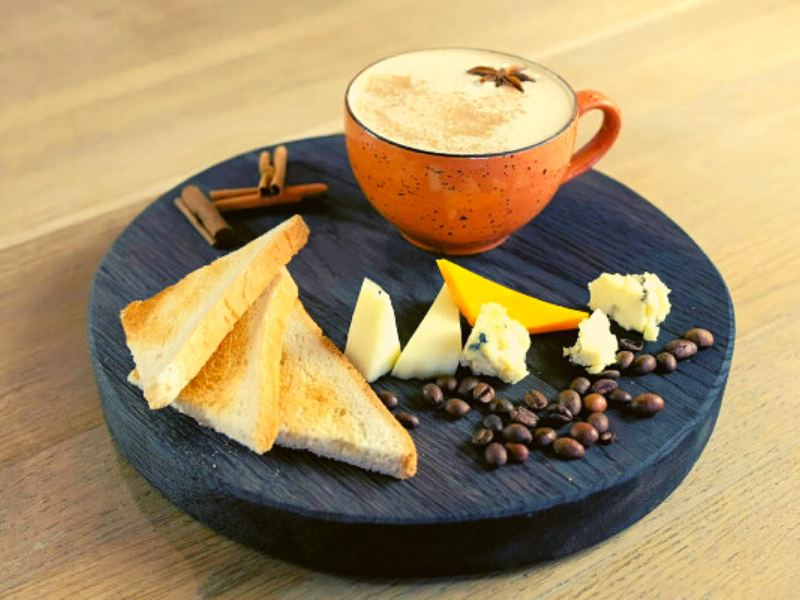 К «Сырному кофе» можно подать гренки с сыром, горячие бутерброды и, собственно, сам сыр.