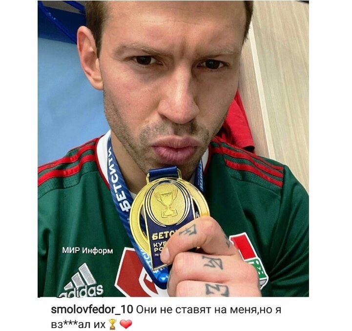 Нападающий московского Локомотива Федор Смолов эмоционально отметил победу своей команды в финале Кубка России. На своей странице Instagram, игрок опубликовал пост, в котором процитировал строчку из песни Poslevkusie рэпера OBLADAET: «Они не ставят на меня, но я вз…ал их». Этим завуалированным постом в социальной сети, Федор отреагировал на решение тренерского штаба национальной сборной России и лично Станислава Черчесова не включать его в окончательный список игроков на матчи Евро – 2020. Напомним, что в финальном матче против самарских «Крылья советов» за Кубок России, Смолов заработал пенальти и вызвался сам его пробить. В начале второго тайма, после реализованного 11-метрового удара, он вывел железнодорожников вперед.