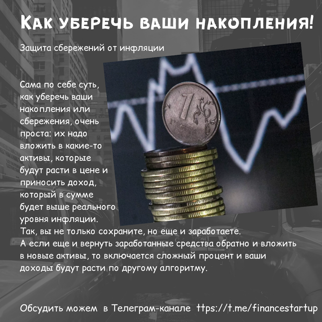 Защита сбережений от инфляции Сама по себе суть, как уберечь ваши накопления или сбережения, очень проста: их надо вложить в какие-то активы, которые будут расти в цене и приносить доход, который в сумме будет выше реального уровня инфляции. Так, вы не только сохраните, но еще и заработаете. А если еще и вернуть заработанные средства обратно и вложить в новые активы, то включается сложный процент и ваши доходы будут расти по другому алгоритму. Самое главное - правильно выбрать эти активы Ставим лайк и разбираемся. Сначала, отвечаем себе на следующие вопросы: 1. На какое время нужно защитить сбережения? Есть активы только для долгосрочной перспективы, есть для среднесрочной и краткосрочной. Нужно это учесть и выбрать сроки для ваших вложений. 2. Насколько вы готовы рисковать? Есть консервативные активы с минимальным уровнем риска, есть более рисковые - агрессивные. Есть очень рисковые активы, но мы о них не говорим, т.к. ваш уровень при такой стратегии должен быть еще подкреплен с