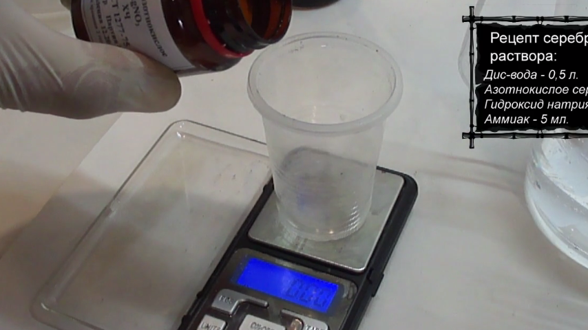 Приготовление серебрильного раствора наиболее загадочный процесс для начинающих. Сейчас все загадки исчезнут. Здесь нам понадобятся две посудины и три компонента не считая воды: - это гидроксид натрия, каустик по простому, аммиак 25%, и "гвоздь программы", азотнокислое серебро или по другому нитрат серебра. Для приготовления 1 литра раствора, делаем следующее: В двухсот граммовый стакан нальём около 100 мл., в литровый стакан - 500 мл. Каждому стакану палку-мешалку. Первым разводим гидроксид натрия, отвешиваем 4 грамма и растворяем в двухсот граммовом стакане, до полного исчезновения в воде. Далее отмеряем 4 грамма нитрат серебра. Очень аккуратно вещество дорогое, просыпать не выгодно. Отмерили, растворили в литровом стакане Сейчас наступает самый интересный процесс. Набираем 10 мл. аммиака, используем 20 кубовый шприц. И начинаем по каплям добавлять в раствор с нитратом серебра при этом помешивая. Наблюдаем помутнение раствора. Аккуратно капаем и перемешиваем, до полного осветления ра