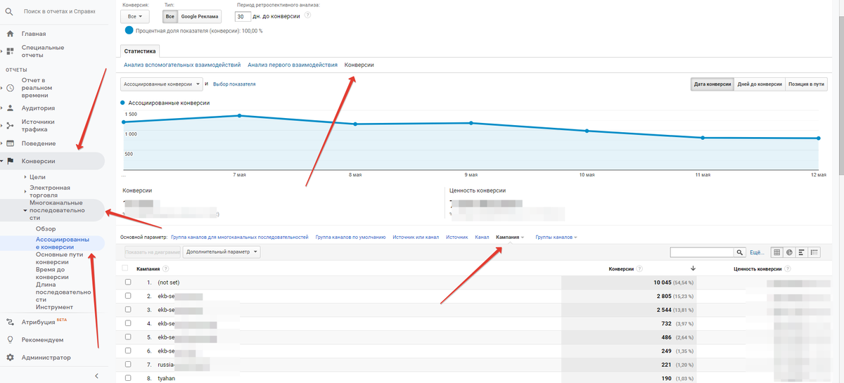 Чтобы понять, приносит ли нам кампания какую-то непрямую пользу, нужно посмотреть, участвует ли она в цепочке покупки. Например, мы запускаем охватную РК в соц. сетях. Прямых покупок по ней, скорее всего, почти не будет. Но нам надо понимать, как эта РК влияет на принятие решения о покупке. Если этого не понимать, она просто будет крутиться, а мы ничего о ней не знать. Для этого можно полезть смотреть "Многоканальные последовательности" и искать, где там в цепочке наша РК. А можно сделать так: Здесь мы присваиваем РК "100%-ный вес", т.е. говорим, что покажи нам, когда РК, в принципе, участвовала в цепочке. В столбце конверсии вы увидите это число К сожалению, показы объявления здесь учитываться не могут, поэтому такая аналитика не до конца корректно, но хотя бы что-то.