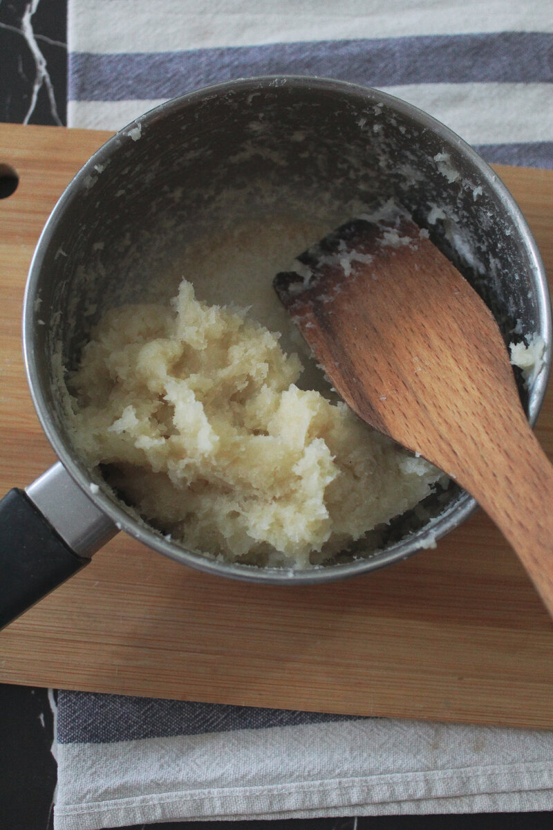 Снять с огня. Остудить слегка,добавить по одному яйца,перемешать миксером.