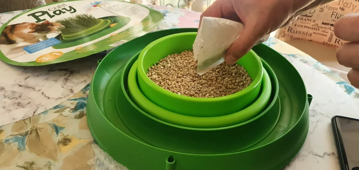 Что-то у нас в "саду для выращивания травы для кошек" как-то не густо травы этой. 😁 Делала обзор 9 дней назад (ссылка). В один "сад" засыпала идущий в комплекте "вермикулит" и семена. А во второй, где в комплекте не было что сажать, я землю засыпала и всё те же семена из первого "сада" (их там много было). Что получилось? Да ерунда какая-то получилась. 😁 Причём такое безобразие что в одном, что во втором "саду". Тощие травинки, которым корням зацепиться не за что (слишком жидкая субстанция) и они с лёгкостью вытаскиваются, едва потянешь за травинку. Тут две проблемы могут быть. Первая - семена. Ведь деже в землю посаженые точно такими же редкими травинками взошли. Но в земле они хотя бы держатся, цепляются за землицу русскую, а в вермикулите окаянном вообще находиться не хотят - норовят поскорее его покинуть. Так что даже нечего особо было щипать. Вот как игрушка "сад" заинтересовала всех: мячик погонять, с "бабочкой" поиграть. Травку Василиса и Маруся погрызли слегка, а