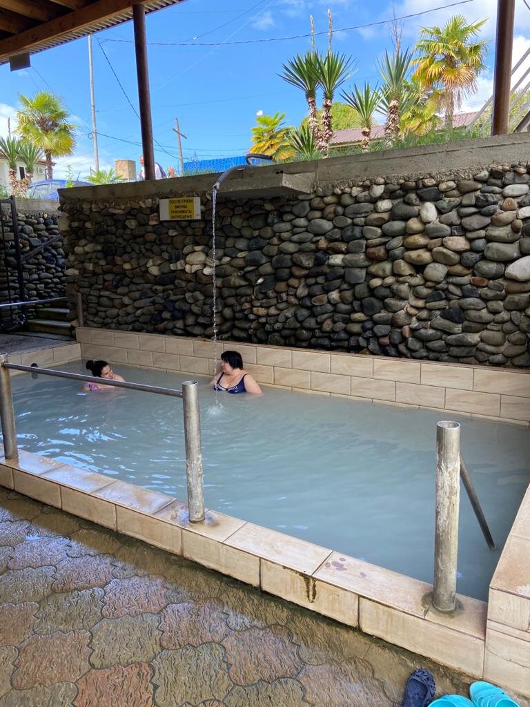 Горячие ванны в селе Приморском Гудаутского района Абхазии. Я живу в городе Сочи. Мы решили съездить в Абхазию поплескаться в горячих целебных источниках. Выехали из дома уже вечером в 18:30 по Москве. Приехали на границу уже поздно в 20:30. Границу прошли сразу, благо народу никого не было. Россиянам можно пройти по российским паспортам, проблем нет. Маршруток уже не было, поскольку сейчас месяц май и практически сезон еще не начался. Только таксисты. Мы решили переночевать в Цандрипш. На сайте Букинг.ру нашли гостевой дом у Ларисы. За нами приехала машина, отвезли нас. Лариса лично встретила нас очень гостеприимно с бутылкой местного Абхазского вина. На следующее утро мы пешком дошли до трассы и стали ловить маршрутку до села Приморское Гудаутского района. Поймали маршрутку до Нового Афона и он оставил нас прямо возле села Приморское, там где стелла погибшим воинам во время абхазо-грузинской войны. Пешком дошли до горячих источников, благо недалеко и шли мы всего 15 минут. Тут же