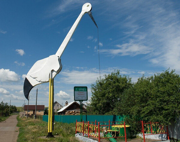 Здесь можно увидеть и придорожный родник-самовар, и водонапорную колонку в виде дельфина. Но, пожалуй, больше всего привлекает внимание забавный колодец-журавлик, который будто выпорхнул из кадра какого-то детского мультфильма.