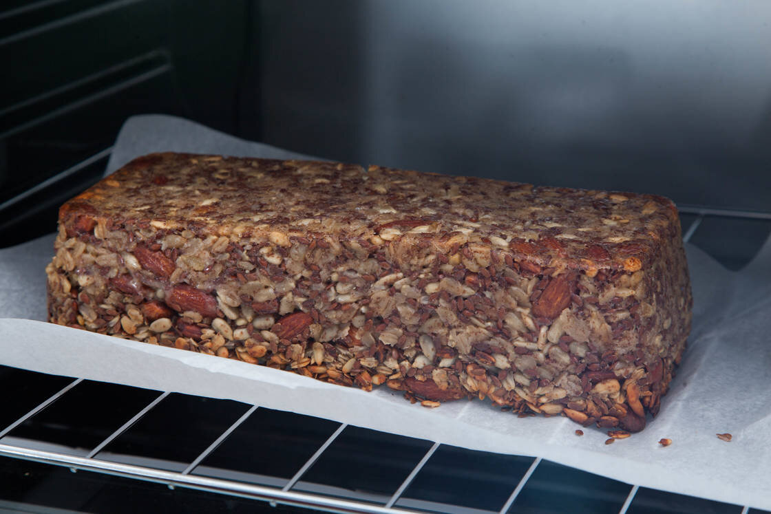 Цельнозерновой хлеб с хорошим составом настолько непросто найти, что проще сделать его самостоятельно. Тем более, что это совсем несложно! Ещё один плюс этого рецепта — при приготовлении не нужно использовать, а значит пачкать и мыть много посуды. Замешивать тесто можно сразу в силиконовой форме для хлеба! Из чего делать хлеб? подсолнечные семечки 1 стакан миндаль ½ стакана лен ½ стакана + 6 ст. л. (перемолоть либо заменить на льняную кашу) овсяные хлопья 1 ½ стакана соль морская 1 ч.л. сироп топинамбура (виноградный сахар) 1 ст. л. кокосовое масло (растопленное) 3 ст. л. вода 1 ½ стакана Смешайте все сухие ингредиенты в одной ёмкости (в форме, если используете её), а все жидкие — сироп, масло и воду — в другой. Перемешав ингредиенты в обеих ёмкостях, залейте сухую смесь жидкостью и тщательно перемешайте. Оставьте получившееся тесто при комнатной температуре не меньше чем на два часа (можно на ночь или на день). Чтобы понять, готов ли хлеб к выпечке, отогните края формы. Если масса