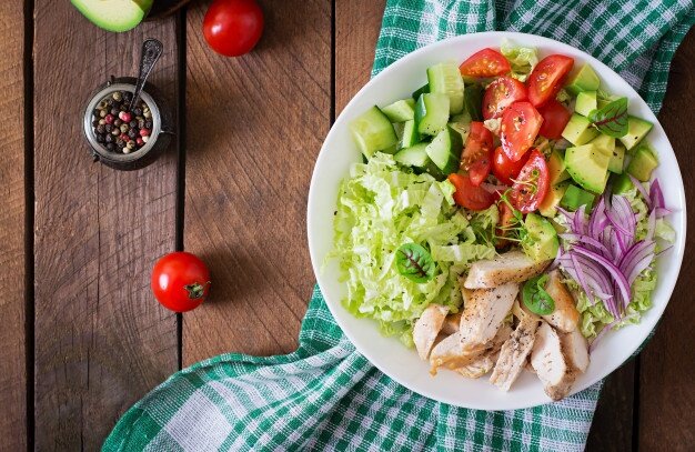 Если вы придерживайтесь здорового питания и следите за своей фигурой. Мы подготовили для вас рецепт диетического салата с курицей, авокадо, огурцом, помидорами и капустой, который всем понравится. Нежное куриное мясо прекрасно сочетается с авокадо, огурцом, помидорами и капустой. Изысканный и вкусный салат можно подавать в праздники и будни. Также можете добавить любимый соус. Рецепт салата Ингредиенты: – 200 граммов куриного филе; – 1/2 авокадо; – 1 огурец; – 2-3 томата; – 1 луковица (салатная); – пекинская капуста; – листья Мангольд; – 1 столовая ложка растительного масла; – перец; – соль.