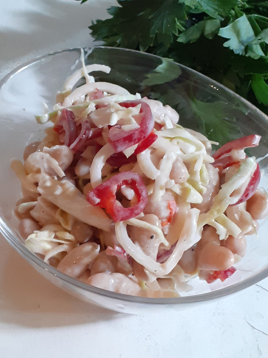 - Далее - из банки с консервированной белой фасолью сливаю жидкость и добавляю фасоль к капусте с перцем.