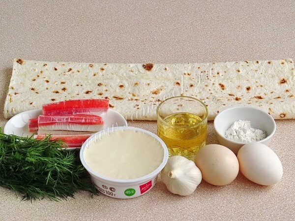 Ингредиенты: Армянский лаваш – 1 шт; Мягкий плавленый сыр «Сливочный» – 200 грамм; Чеснок – 3 дольки; Крабовые палочки – 100 грамм; Зелень укропа – 0, 5 пучка; Масло подсолнечное дезодорированное – 3 ст. ложки; Яйца куриные – 2 шт; Мука пшеничная – 1 ч. ложка. Пошаговый рецепт с фото Если у вас намечаются дружеские посиделки, то попробуйте удивить гостей этими необычными гренками. Они хорошо подойдут под пиво и другие напитки, их охотно едят дети. Сколько бы вы их ни сделали, тарелка очень быстро опустеет. Приятного аппетита! Для приготовления гренок нужно взять лист армянского лаваша, крабовые палочки, мягкий плавленый сыр (у меня «Сливочный»), зелень укропа, яйца, муку пшеничную, масло подсолнечное дезодорированное и чеснок. Крабовые палочки освободить от целлофановой упаковки и мелко нарезать. Дольки чеснока очистить от сухой оболочки и натереть на мелкой тёрке. Сыр выложить в миску и добавить к нему чеснок. Массу хорошо вымешать. Зелень укропа вымыть в проточной воде, обсушить и м