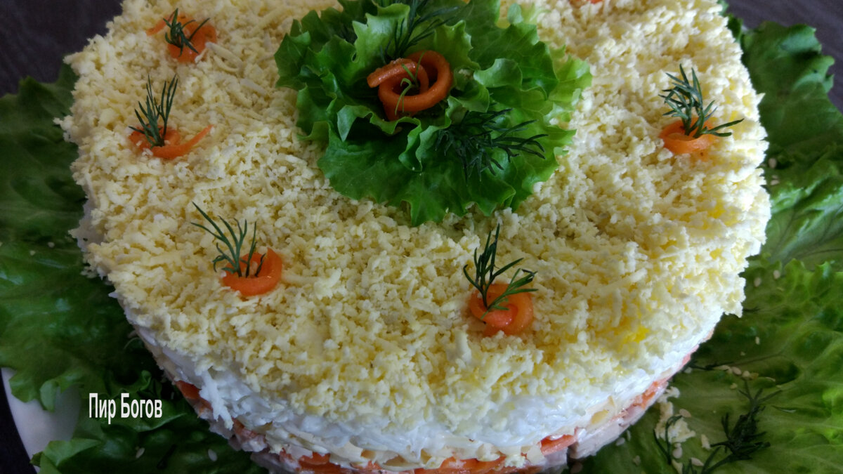 Вкусный и сочный салат из курицы и моркови по-корейски. Морковь со специями добавляет остроты и аромата, а твердый сыр придает сливочный вкус. Салат готовится из простых и доступных продуктов. Будет прекрасным украшением праздничного стола. Салат выкладываю в кольцо Ф17см. Состав: 300гр куриного филе 4 яица 150гр моркови по-корейски 100гр твердого сыра Майонез Соль, перец и чеснок по желанию. Листья салата *** Подробный рецепт можно увидеть в видео на моем канале здесь или на канале YouTube Пир Богов вот здесь 🥗. Еще там есть много вкусных рецептов. 🥗🥧Подписывайтесь))) 😉 *** Способ приготовления: Куриное филе отварить в подсоленной воде с лавровым листочком. Остудить и нарезать кубиком. Листья салата помыть и выложить на полотенце сушиться. Сварить яйца. Отделить желтки от белков и натереть на терке. Сыр натереть на крупной терке. Длинную морковь по-корейски разрезать на кусочки. По желанию можно в майонез выдавить чеснок и добавить перца. Но стоит учитывать, что в моркови уже ес
