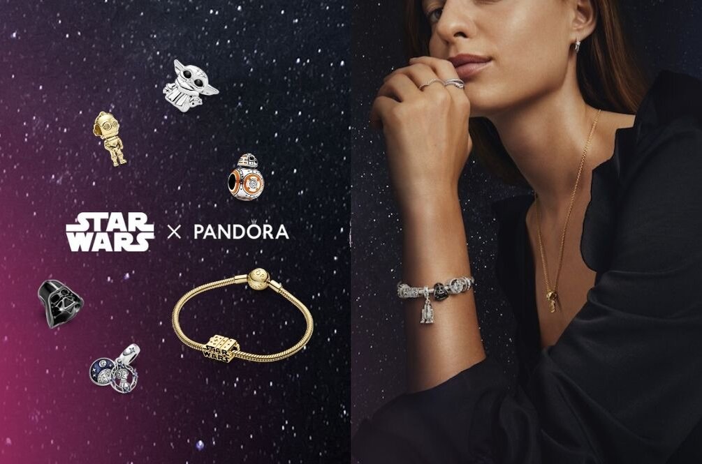 В последние годы коллаборации брендов модной одежды и аксессуаров с представителями киноиндустрии стали происходить все чаще. Покупателям нравится обладать вещью с отсылкой к их любимому фильму, сериалу или мультфильму. Не стал исключением и знаменитый ювелирный бренд Pandora, выпустивший коллекцию шармов и браслетов по мотивам космической саги «Звездные войны». В коллекцию вошли 11 шармов и браслет, замок которого украшен логотипом Star Wars. Шармы посвящены как героям, так и известным символам саги: - Дроид C-3PO, - логотипы в золотом и серебряном цвете, - Дроид BB8, - Дроиды R2D2 и C3PO, - Чубакка - Принцесса Лея Органа, - лазерные мечи, - магистр Йода, - R2D2, - Дарт Вейдер. В шармах этой серии космическое небо выполнено с помощью эмали, а блеск звезд и сияние мечей передают камни циркония. По задумке бренда, эта коллекция должна соединить в себе футуризм и винтажный стиль «Звездных войн». Формат украшений позволяет составлять различные комбинации из шармов как на браслете, так и н