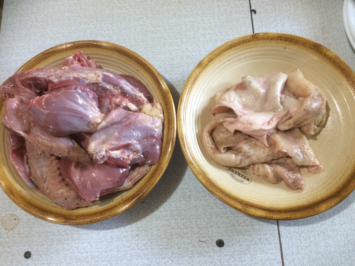 В нашем небольшом хозяйстве есть различные виды птиц. Но пока что параметров, необходимых для приготовления еды, достигли только пекинские уточки. Многие считают, что пекинские уточки жирноваты - не спорю, есть у них такой недостаток. Но есть у них один значительный плюс - растут они быстро. Забойного возраста достигают в 2 - 2,5 месяца. Утиная семья активно делает яйца. В инкубатор мы закладываем новые партии этих яиц. Поэтому, пока наши индейки, индоутки и гуси растут, мы используем для приготовления еды пекинских уточек. Мясо пекинской уточки - для нас ежедневная пища. Рассказываю как я готовлю пекинских уточек, что они у меня всегда не жирные и не жесткие. Беру утку и отделяю сразу кожу и жир.На фото ниже я использовала пол- утки. Получилось 730 грамм утиного мяса с костями и 270 грамм утиного жира и кожи. Мясо утки разрезаю на кусочки и складываю в сотейник. Добавляю специи, которые есть под рукой. Сегодня это базилик, куркума, немного мо