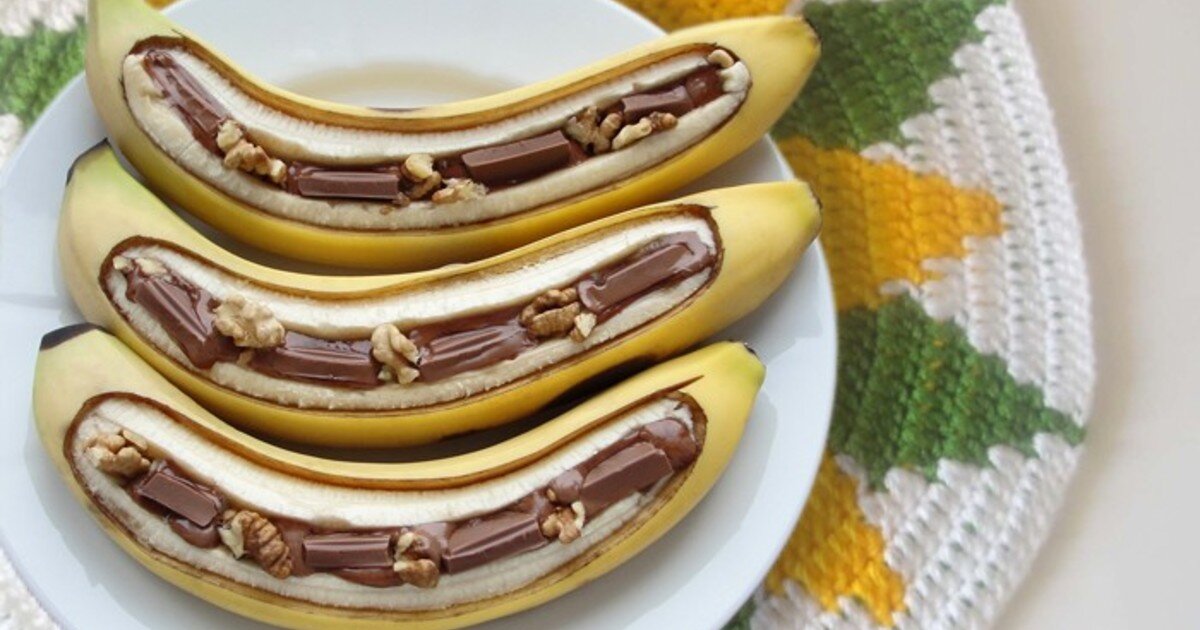 Наверно у всех дети страшные сладкоежки. Если мы что то готовим на открытом огне, то не стоит про них забывать. На такой случай есть изумительный рецепт десерта, который понравиться вашему чаду. Это блюдо ребёнок может приготовить сам, под вашим руководством. Ему будет приятно, что вы доверили такое ответственное дело. Итак, вам понадобятся бананы, шоколад, орехи, можно вместо шоколада зефир, фольга. Все продукты произвольные. Банан надрезаете сверху, но не до конца. В прорезь кладёте шоколад с орехом или зефир. Затем, нафаршированный банан заворачиваете в фольгу. Это нужно для того, чтобы начинка не вытекла при нагревании. Завёрнутые бананы кладём на решётку и готовим на углях примерно 10 минут. Ваши дети будут в восторге от такого десерта, да и вам тоже понравиться. Приятного аппетита!!!