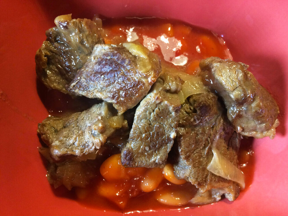 Этот рецепт я нашёл в Сети и сначала отбросил из-за слишком явной простоты. Но потом что-то меня в нём зацепило, и я решил попробовать. На сайте говорилось, что это блюдо испанской кухни – в этом я не уверен, но то, что получается вкусно, можете не сомневаться. Проверено. А испанцев среди нас не так много, так что опровергнуть некому. Итак, сегодня мы будем готовить очень легкое, но не очень быстрое блюдо. Говядина, тушёная в горчично-винном соусе. Нежная, ароматная и очень вкусная. Для этого блюда нам понадобится хорошая говяжья мякоть. Это может быть вырезка или огузок, главное, чтобы свежая и красивая. Нарежем мясо кубиками или пластинками – как вам больше нравится. Что приятно – можно особенно не возиться с удалением плёнок и жира, всё в итоге будет мягким, как и должно быть в тушёном мясе. Сколько взять мяса – это вы решайте сами, у меня было с полкилограмма. Но поверьте, уходит оно быстро, поэтому можно взять и побольше. Разогреем в казане или сковороде растительное масло и неспе