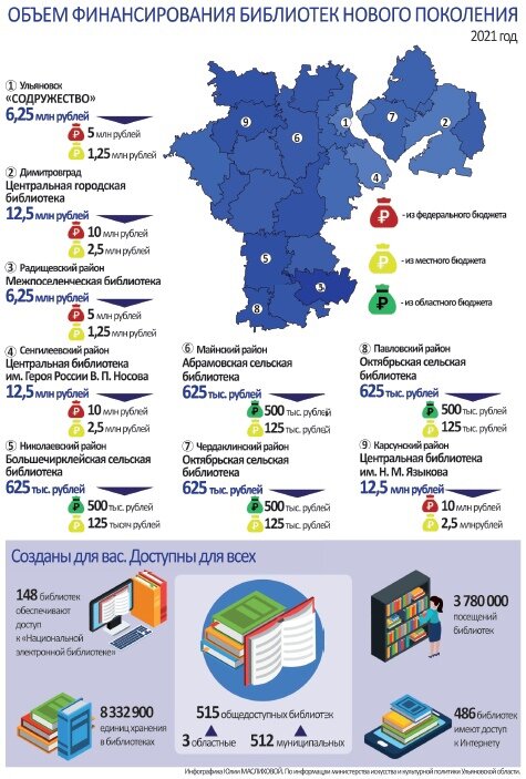 Благодаря действию нацпроекта в прошлом году открыты три модельных библиотеки: Центр литературного краеведения имени И.А. Гончарова в Ульяновске, детская библиотека в Димитровграде и Сенгилее. Кроме того, создано четыре учреждения регионального образца: Салмановская сельская библиотека в Ульяновском районе, Ленинская поселковая библиотека в Барышском районе, Чуфаровская городская поселенческая библиотека в Вешкаймском районе и Большекандалинская сельская библиотека в Старомайнском районе.
