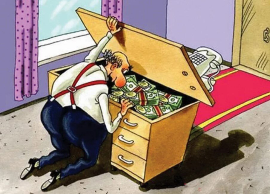 Вот и дожился, (не) счастливый Российский чиновник! Квартира в которой живёт ломится от ДЕНЕГ и роскоши, ещё квартирка есть - как сейф и туда уже складывать не куда, домик в деревне из космоса виден и там уже складировать не куда! Исповедь! Каждый день аресты НАШИХ, Вот - вот и за мной придут! Какая блин работа, вся голова забита вопросом, Ну-у-у, куда бы тебя спрятать, — "МОЯ ПРЕЛЕСТЬ!", из сейфа не вынести - соседи с топором за углом караулят, любовник жены косо смотрит и знает о сейфе, да и жена мутит что то, да и любовница тоже знает и просит много - засада!, водитель знает, полиция знает, фсб знает - Ай-яй-яй, ВСЕ ЗНАЮТ! и дети знают и просят - просят и всем всё мало! Все меня несчастного преследуют! Снова кто то миллион подсунул, блин в карманы не вмещается, опа, ещё миллион, АЙ-ЯЙ-ЯЙ придут не придут за мной, фу-у-у - не пришли - посмотрю в окно как там, спокойно, пока спокойно - хорошо, возьму пакет или сумку - хорошо сегодня перед обедом, теперь бы, после обеда до вечера