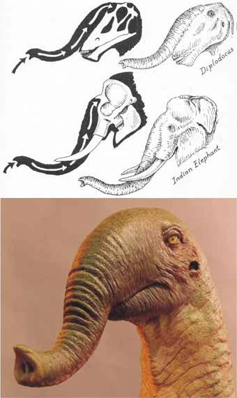 Исторически область исследований мезозойских рептилий преследуется причудливыми и порой невероятными гипотезами, одной из них является предположение о наличии у завропод хобота. В отличие от большинства четвероногих, костные ноздри завропод расположены на дорсальном уровне: у диплодоковых они расположены прямо над глазами в области, которую можно назвать лбом, а у камаразавра и брахиозавра они находятся на куполообразном образовании черепа. Эта идея знакома большинству ученых и любителям-натуралистам и неоднократно публиковалась в популярных книгах: Грегори Айрон изобразил дикреозавра с коротким хоботом для публикации Роберта Лонга и Сэмюэла Уэллса (Long & Welles, 1980), Роберт Беккер проиллюстрировал диплодока с хоботом в «Заблуждениях о динозаврах» (Bakker, 1986) и Джон Сиббик — для книги «Когда динозавры правили Землей» (Norman, 1985 год).