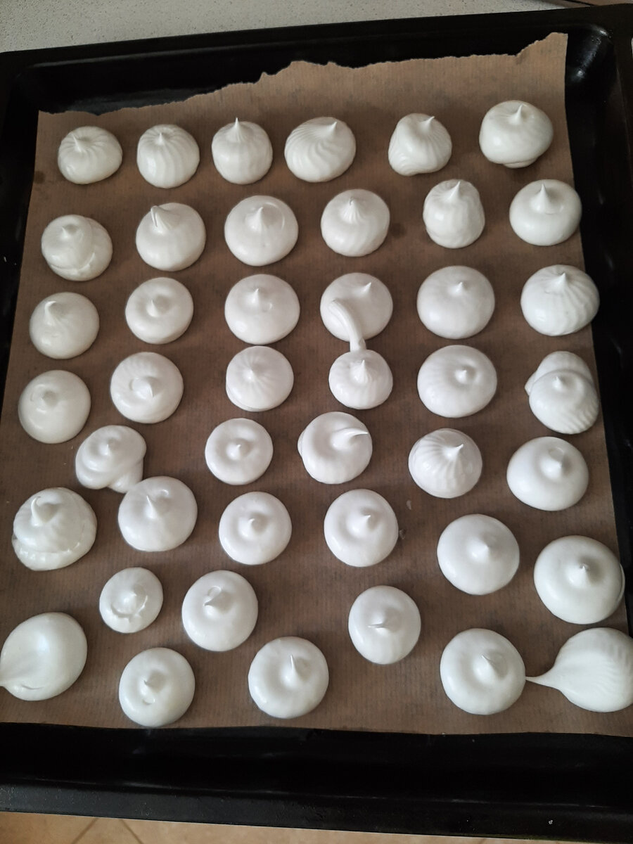 Очень простой и легкий рецепт чтобы порадовать своих близких вкусным десертом. 1. 2-3 яйца 2. ванилин 3. лимонная кислота, на кончике чайной ложки 4. ванильный сахар (80 гр.) Для приготовления необходимо отделить белки от желтков, отделять нужно аккуратно, если желток попадет в белок, густая пена может не взбиться. Начинаем взбивать на небольших оборотах, постепенно их увеличивая, добавьте щепотку лимонной кислоты, это не даст упасть белку. Иногда я использую щепотку соли вместо лимонной кислоты. Когда белок станет упругим начните вводить сахарную пудру, если нет сахарной пудры, можно заменить и обычным сахаром, но взбивать придется дольше, чтобы сахар растворился и не был крупинками. Туда же в белки добавьте ванилин, можно конечно и краситель добавить для цвета. Далее выкладываем на пергамент безе и ставим в разогретую духовку. У меня духовка разогрета до 120 С градусов, ставим противень и начинаем "сушить", главное чтобы температура не поднималась больше, иначе они сгорят. Начните с