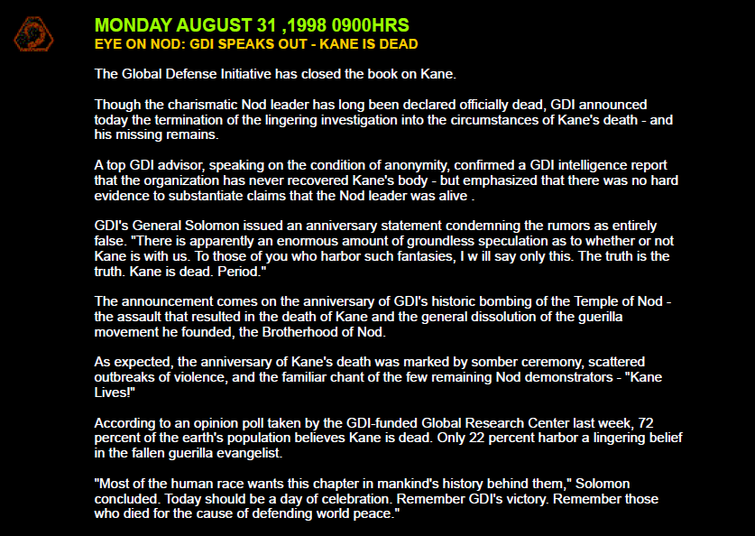 Примечание - Это мой неофициальный перевод вымышленных новостей, связанный с Command & Conquer: Tiberian Sun. Ссылка на оригинальный архив. ВЗГЛЯД НА NOD: GDI ЗАЯВЛЯЕТ - КЕЙН МЕРТВ Глобальная Оборонительная Инициатива закрыла дело Кейна. Несмотря на то, что харизматичный лидер NOD уже давно официально был объявлен погибшим, GDI объявила сегодня о прекращении затянувшегося расследования обстоятельств смерти Кейна - и его пропавших останков. Высокопоставленный советник GDI, рассказывая на условиях анонимности, подтвердил доклад разведки GDI о том, что организация так и не нашла тело Кейна, но подчеркнул, что не было никаких убедительных доказательств, подтверждающих утверждения о том, что лидер NOD был жив. Генерал GDI Соломон выступил с юбилейным заявлением, в котором осудил слухи как полностью ложные: "По-видимому, существует огромное количество беспочвенных предположений о том, с нами Кейн или нет. Тем из вас, кто питает подобные фантазии, я скажу только это. Правда есть правда. Кейн