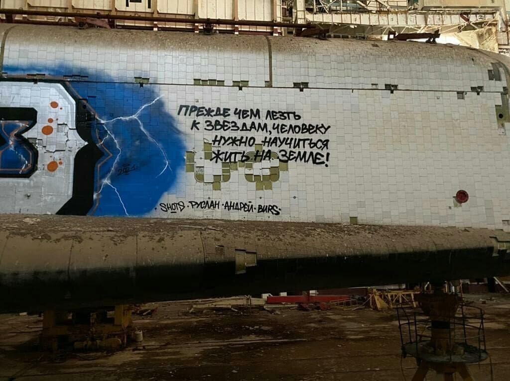 На космодроме Байконур неизвестные разрисовали недостроенный космический корабль «Буран». Ангар с заброшенным шаттлом стал одной из местных достопримечательностей для туристов. Кто-то из посетителей решил оставить послание на бортах корабля. Ставьте лайк и подписывайтесь на наш канал , чтобы не пропускать новые публикации! Граффитисты разрисовали «Буран» различными лозунгами — наиболее заметной сделали надпись «Добро». Также на корабле появилась фраза «Юра, мы приехали», отсылающая к знаменитой реплике Юрия Гагарина «Поехали!». Еще одна цитата гласит: «Прежде чем лезть к звездам, человеку нужно научиться жить на земле». Анонимные «художники» оставили подпись под своим творчеством — граффити сделали некто Shots, Руслан, Андрей и Burs. Корабль разрисовали художники из Петербурга DobroCrew. Молодые люди полтора года готовились к акции, а в ангар пробирались тайком: художникам пришлось двое суток скрываться в степи от охраны и патрулей. Отметим, что «Буран» был амбициозным проектом позднег