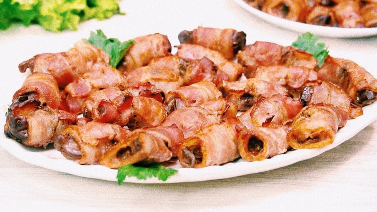 Сейчас самое время провести время на природе, на даче. Все отдыхают, устраивают застолья, жарят шашлыки, а кто-то празднует свой день рождения. Дабы немного отдохнуть от шашлыков, хочу поделиться с вами отличной закуской из печени к праздничному столу и не только праздничному. Готовится очень быстро, а главное вкусно. Минимум ингредиентов. Давайте начинать! Какие ингредиенты для приготовления? Как будем готовить? 1 этап. Для начала возьмем мисочку и разрежем туда кусочки печени. 2 этап. В отдельное блюдо выжмем лимонный сок и избавимся от косточек при помощи сита. Сюда же отправляется соевый соус и мед. Немного поперчим и добавим красную паприку. Хорошенько перемешиваем. 3 этап. Выливаем наш соус на печень и вновь мешаем. Накрываем блюдо пищевой пленкой и оставим на столе на пару часов. Как вы могли догадаться, после этого снова нужно помешать, чтобы закуска пропиталась соусом. 4 этап. Осталось совсем немного. Самое время достать бекон. Нарезаем его в виде коротких полосок, в которые