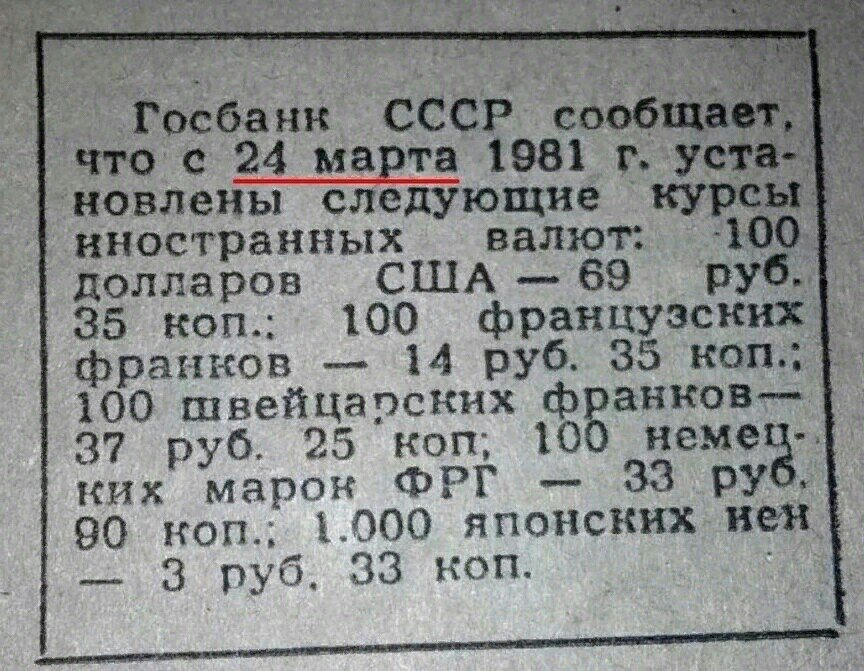 Как видим курс валют постоянно менялся. Более того по этому курсу советский гражданин мог поменять лишь 30 советских рублей. И лишь при условии что он едет за границу. Свободной купли-продажи валюты в СССР не было. Более того за покупку или продажу валюты было предусмотренного уголовное наказание в виде лишения свободы (тюремного заключения).