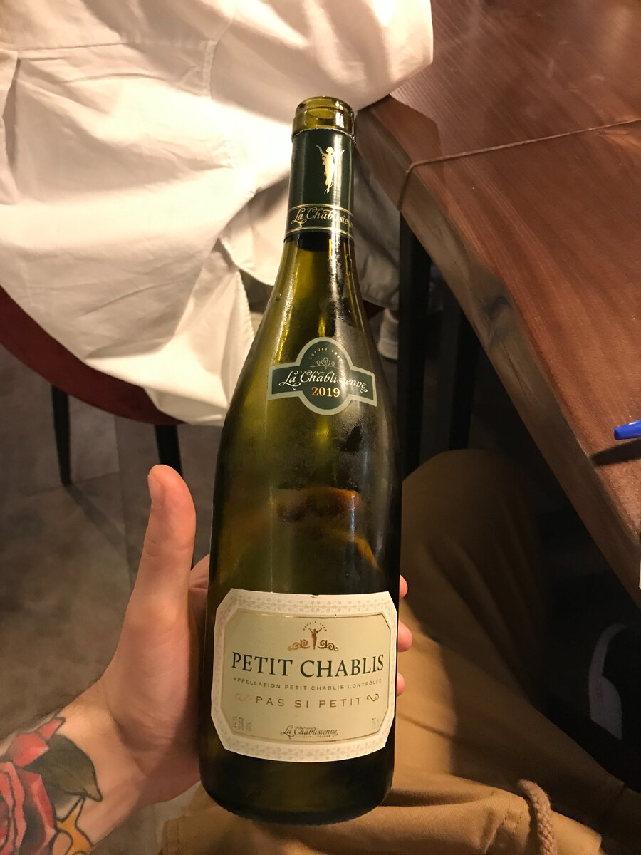Я вновь решил поделиться с вами своими дегустационными заметками по поводу нового вина, которое я попробовал на обучении сомелье Petit Chablis AOC "Pas si Petit" – наиболее простой и демократичный сорт вина Шабли. Производится он из винограда Шардоне – «короля» белых сортов винограда. Лучшие сорты Шардоне собираются на его родине, в Бургундии, с разных экспозиций области Шабли. Этот сорт вина обладает светло-золотистым оттенком. Аромат вина отличается свежестью тропических и цитрусовых фруктов, трав, весенних цветов и минеральных нот. Вкус вина Petit Chablis освежающий и утончённый, с мягкой кислинкой. Этот сорт вина оставляет продолжительное сухое послевкусие в виде оттенков цитрусовых и белых фруктов, смешанных с чистыми минералами. Кулинарные предложения: морепродукты и рыба - салат из крабов, рыбный картофель, осьминог, тартар из лосося, карпаччо из лосося с артишоком и йогуртовой заправкой, лягушачьи лапки, жареные лангустины и креветки, свежие устрицы, козий сыр Лучше всего вин