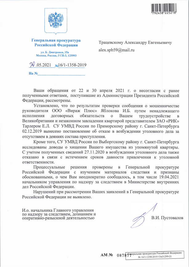 Добрый день! Чем сотрудники Вашего управления по работе с обращениями граждан отличаются от ЛЖИВОГО, ПРОДАЖНОГО МВД И ПРОКУРАТУРЫ РФ, которые на протяжении двадцати одного года, объявив настоящую войну, осознанно бездействуя по поводу МОШЕННИКОВ И ВОРОВ ИЗ МПГ по торговле людьми ЯБЛОКОВА И.Б. И ЛЖЕКРЕДИТОРОВ ИЗ ЗАО "РИК"-ТАРЛЕР Е.Л....ЛЖЕДОВЕРЕННАЯ НАШЕЙ СЕМЬИ, госпожа МАРКОВА, орудовавшая по поддельной доверенности, якобы от имени нашей семьи в 2005г., за год до этого лично руководила при пособничестве Начальника 59оп Выборгского р-на СПб Данилевич И.Т., За взятку, которого все эти годы покрывает Начальник УМВД Выборгского р-на СПб Автомонов С.В., продажный суд Выборгского р-на СПб-судья Коломиец О.Л., Прокуратура того же р-на и целая армия Начальников управлений по надзору за УПД ОВД как Прокуратуры СПб, так и Ген. Прокуратуры, как-то Вешняков А.В., Гусев,Багавиев Р.И.,Пустовалов, который выслал мне свою стандартную, полную вранья отписку от 21.05.2021г., в которой он ссылается на истечение сроков давности, ПРИ ЭТОМ хочу в ОЧЕРЕДНОЙ РАЗ ОТМЕТИТЬ, ЧТО СРОКИ ДАВНОСТИ УПУЩЕНЫ НЕ МНОЙ, А МВД и ПРОКУРАТУРОЙ, которые совместно, на протяжении 21 года, объявив настоящую войну нашей семье, встали на защиту МПГ и ЗАО "РИК" своим БЕЗДЕЙСТВИЕМ, а затем встали на защиту своих продажных коллег и СОТРУДНИКОВ МВД. Более МИЛЛИОНА МОИХ ЗАЯВЛЕНИЙ И ОБРАЩЕНИЙ С ПРИЛОЖЕНИЯМИ БЫЛИ НАПРАВЛЕНЫ МНОЙ В МВД И ПРОКУРАТУРУ ЗА ЭТИ 21 ГОД. МЕНЯ НИ ОДНА ИЗ ЭТИХ СТРУКТУР ТОЛКОМ НЕ ВЫСЛУШАЛА И НЕ ОПРОСИЛА, ЧТО ОСОБЕННО ОЧЕВИДНО НА ПРИМЕРЕ ПЕРИОДА 2017-по настоящее время!!!??? ЛИБО МОЛЧАНИЕ, ЛИБО ПОЛНАЯ ВРАНЬЯ, НАДУМАННАЯ ОТПИСКА В МОЙ АДРЕС, ЭТО ВСЕ НА ЧТО СПОСОБНЫ МВД И ПРОКУРАТУРА, ВМЕСТЕ ВЗЯТЫЕ. СРОКИ ДАВНОСТИ УПУЩЕНЫ ИМЕННО ЭТИМИ СТРУКТУРАМИ!!! ВЫСЫЛАЮ В ВАШ АДРЕС УПОМЯНУТУЮ ОТПИСКУ ЗА ПОДПИСЬЮ теперь Начальника Главного управления по контролю за УПД ОВД Ген Прокуратуры В.И.Пустовалова от 20.05.2021г., выслаееую в мой адрес лишь 24.05.2021г.