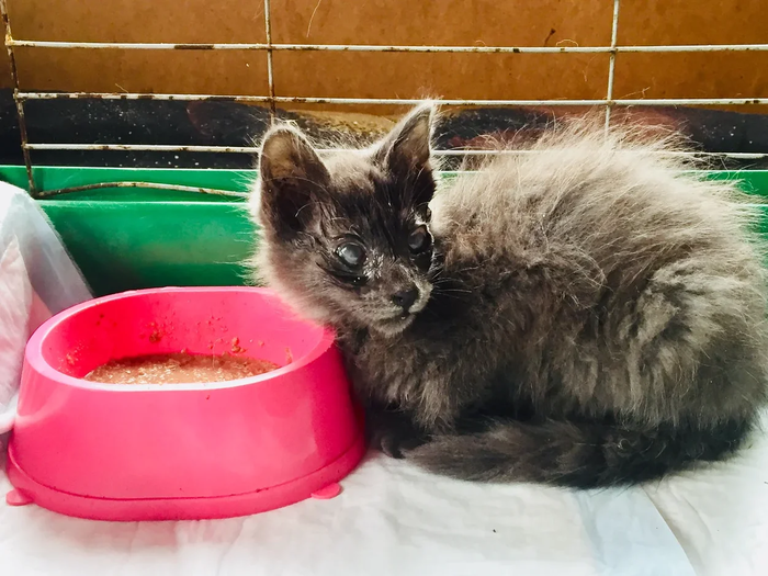 Вчера я нашла серенького очень красивого котенка одного на дачном участке. Он сейчас почти ничего не видит, но это пройдет