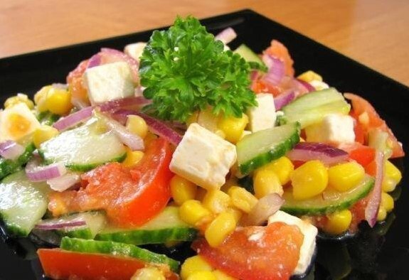 Легкий, вкусный салат, а главное, простой в приготовлении! Идеально подойдет, если к вам неожиданно пришли гости! Овощи можно добавить любые, по вкусу, главное не забывать о кукурузе, брынзе и красном луке.