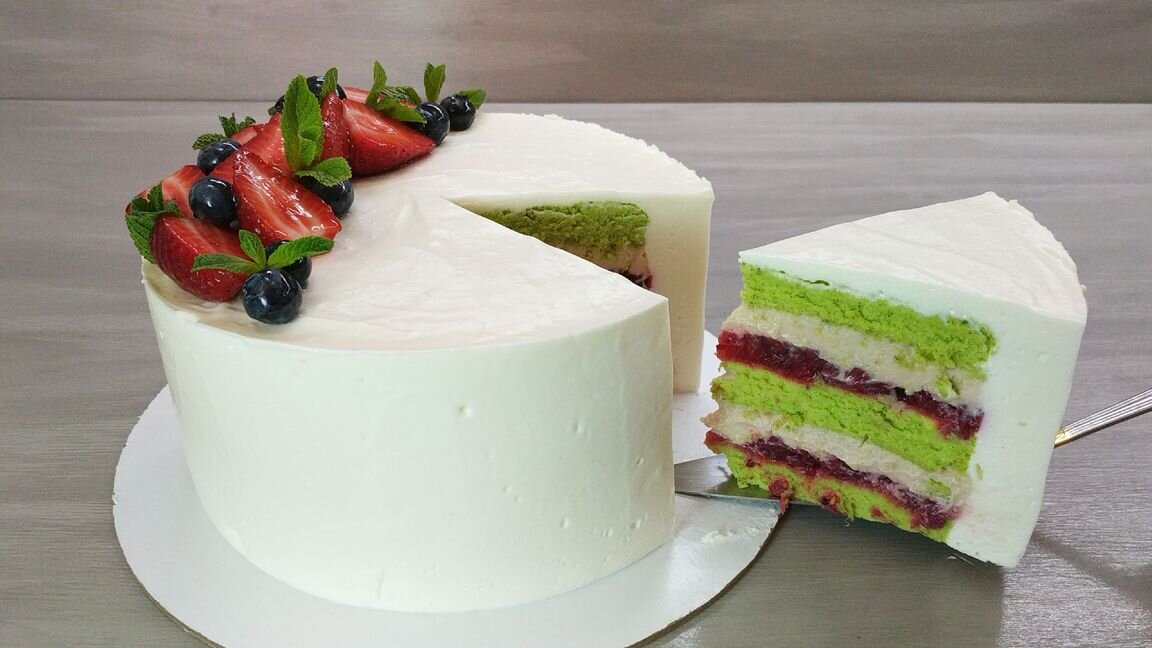 Нежный бисквитный торт с летним видом и вкусом. Главную роль в нём я отвожу шпинатному хлопковому бисквиту. У него такая приятная влажная текстура и красивый цвет! Очень рекомендую приготовить его и как самостоятельный десерт к чаю. Этот бисквит гармонично дополнен ягодным заварным кремом, кисленькой ягодной начинкой и нежным сырно-йогуртовым муссом.