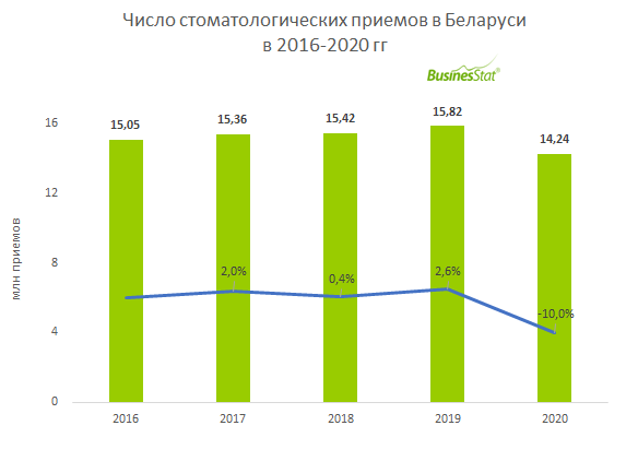 По данным "Анализа рынка стоматологических услуг в Беларуси", подготовленного в 2021 г, за пять лет объем рынка в стране сократился на 5,4%: с 15,05 млн приемов в 2016 г до 14,24 млн приемов в 2020 г. При этом в 2016-2019 гг показатель ежегодно увеличивался на 0,4-2,6% и в конце периода составил 15,82 млн приемов, но в 2020 г сократился сразу на 10,0%. Причиной столь ощутимого спада стала неопределенность потребительских ожиданий из-за экономической и политической нестабильности в стране.