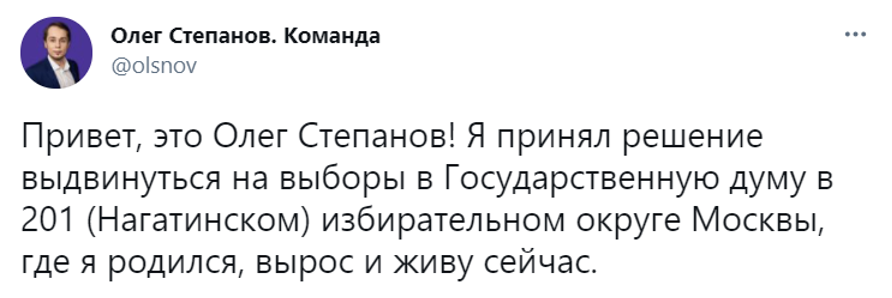 11 мая 2021 года экс-координатор штаба Навального в Москве Олег Степанов заявил о выдвижении своей кандидатуры на предстоящих выборах в Госдуму. А также Степанов объявил сбор средств на организацию работы предвыборного штаба и агитационные материалы в рамках анонсированной кампании: пожертвования будут приниматься на карту и банковский счет главы его штаба Александра Псарева, а также криптокошельки. О сборе средств на «предвыборную кампанию» заявила и Любовь Соболь: пожертвования предлагается переводить по номеру карты или на банковский счет главы штаба Ольги Ключниковой (ранее они поступали на счет мужа Соболь Сергея Мохова), а также через систему PayPal и на криптокошельки. При этом активную информационную поддержку и Степанову, и Соболь оказывают практически все топы ФБК, включая экс-главу сети региональных штабов Навального Леонида Волкова – об этом свидетельствуют записи в его Twitter и регулярные ретвиты публикаций команд Степанова и Соболь. Между тем, еще 4 мая, комментируя пост