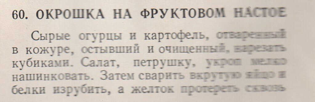 Интересен показался рецепт окрошки на фруктовом настое, для приготовления которого необходимо 400 г фруктового настоя, который готовится из яблок или ревеня или шиповника. Окрошка не мясная, картофель, огурцы, яйцо, сметана и зелень. Если кого заинтересовала такая окрошка, то публикую скрин рецепта из этой книги: