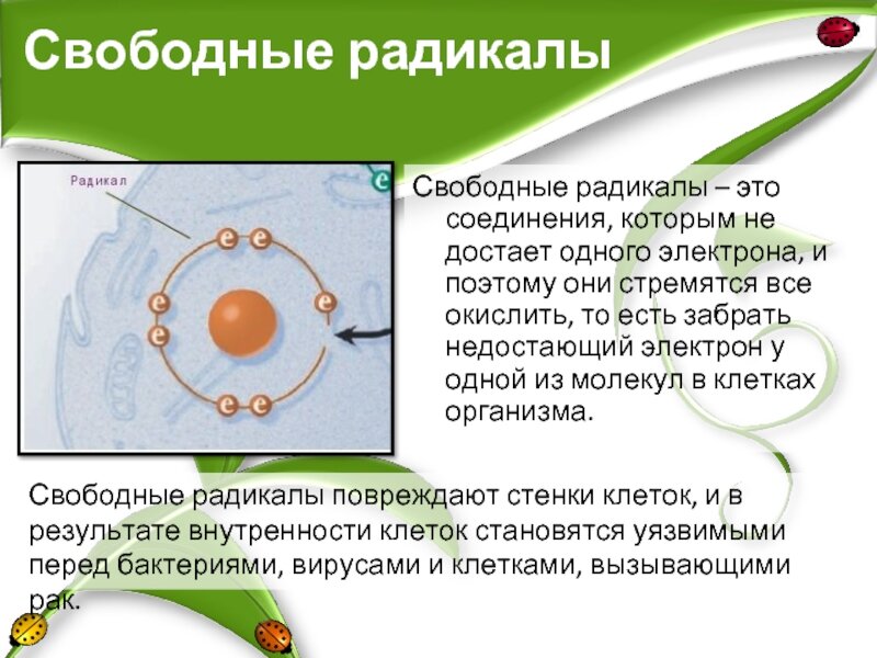 Что такое оксиданты и как они появляются в нашем организме? Оксиданты это особые вещества, которые поступили в организм из окружающей среды либо образовались в результате обмена веществ в клетках организма. У каждой клетки есть внутри электростанция, которая отвечает за выработку энергии, для того чтобы мы с Вами имели силу в мышцах и могли быть жизнеспособны. На этой электростанции происходит сгорание жиров и углеводов при участии кислорода и образуется энергия , но при этом также образуются окиданты. Оксиданты это окисленные вещества, они по своей структуре похожи на частицы из выхлопной трубы автомобиля . У них еще есть другое название которое Вы слышали это СВОБОДНЫЕ РАДИКАЛЫ . Их так назвали потому как такие вещества имеют свободное место и пытаются его отобрать у других клеток. Например здоровая клетка всегда имеет парные элементарных частицы и их четное количество, а свободный радикал имеет непарное количество частиц . Так в чем же опасность свободных радикалов? К