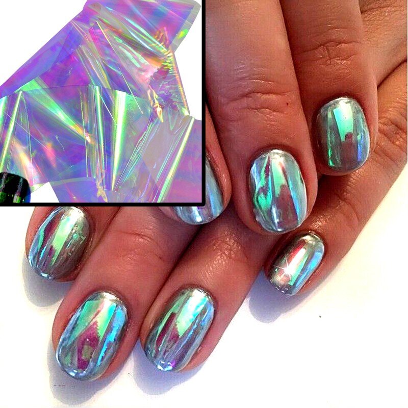 Фольга очень хорошо сочетается с «паутинкой», мраморными или акварельными разводами, или просто она может быть элементом уникального необычного декора ноготков.