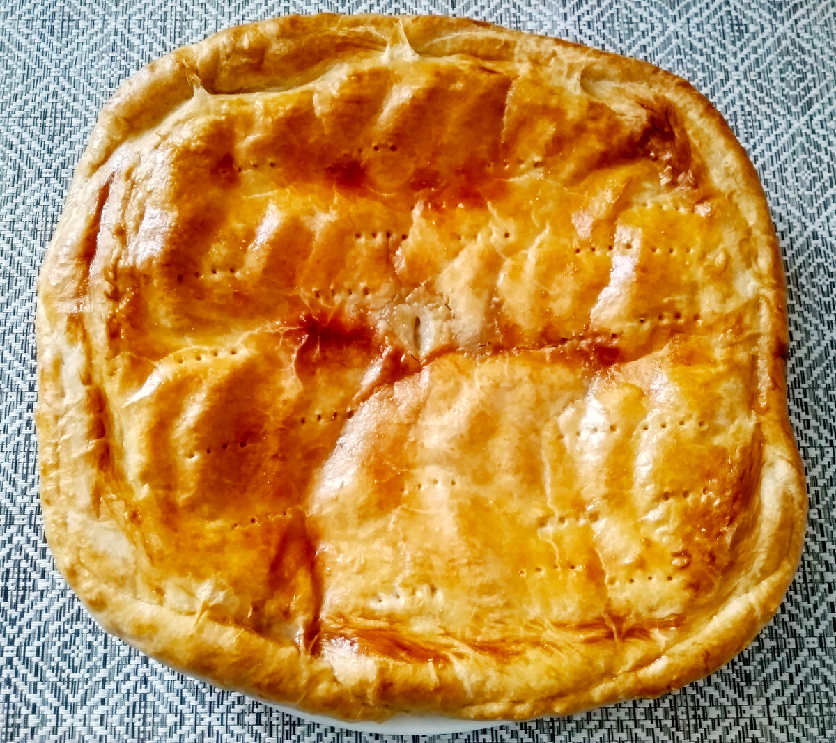 Грушу накрываю вторым пластом теста. Защепляю края слоеного пирога и проделываю небольшое отверстие по центру. Смазываю пирог взбитым яйцом и обязательно проделываю вилкой дырочки по всей верхней поверхности пирога.