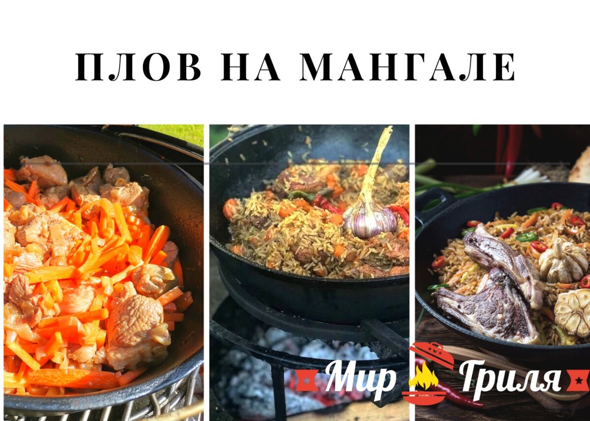 Собрались провести выходные на даче? Чем накормить большую компанию? Есть проверенное сытное блюдо – плов. Главное, купить качественные ингредиенты. Причем речь идет не только о свежем мясе, но и о правильном рисе и специях, которых сделают ваше блюдо ароматным и насыщенным. Что нужно для классического плова на мангале? - Баранина на кости – 2 кг - Рис круглозерный (специальный для плова) - Лук репчатый – 1 кг - Морковь – 1 кг - Зира – 1 ч.л. - Барбарис – 1 ст.л. - Перец красный молотый – по вкусу - Чеснок – 4-5 головок - Соль - по вкусу - Масло растительное – 1 стакан - Вода - 2,5-3 л На мангал нужно установить сетку для барбекю, чтобы сверху поставить казан. Казан необходимо как следует разогреть. В разогретый казан влить масло, довести до кипения и опустить в него баранину, порубленную на средние куски. Жарить мясо до золотистого цвета на сильном огне. К мясу добавить морковь, порезанную крупными брусочками. Морковь довести до гибкого состояния и дать ей подрумяниться. Нарезать куби