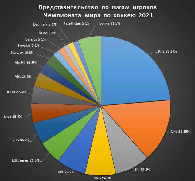 На основе данных портала eliteprospects рассмотрим представителями каких лиг являются игроки сборных Чемпионата мира 2021. В настоящий расчет берем игроков сыгравших хотя бы одну игру на турнире по состоянию на 26 мая. Наибольшее число игроков представляют КХЛ - 93 или 24%. Вторая по представительности NHL - 58 игроков или 15%. Третья швейцарская NL - 32 хоккеиста или 8%. Из 393 игроков, 316 или 80% являются представителями европейских лиг, 77 или 20% американских. Максимальное число хоккеистов из КХЛ в сборных России и Беларуси по 18, Казахстана - 17, Финляндии - 10. Игроков НХЛ больше всего в сборных США и Канады, где их по 16, в российской команде - 7, в сборной Чехии - 6. Наглядно по сборным: Теперь разберемся подробнее сколько игр, в каких чемпионатах и на каких турнирах участники ЧМ 2021 успели провести в текущем сезоне до мирового первенства. Соответственно, в самой представительной лиге КХЛ сборники получили личный опыт в 4814 играх, в NHL - в 2453 играх, в швейцарской лиге NL