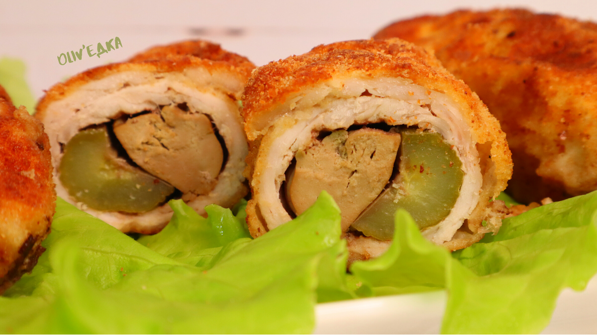 Друзья, приготовила такие необычные ясные рулетики, нам очень понравились, сытные, вкусные. Можно подавать к столу на праздник или готовить в обычные день – ведь это совсем не сложно!👍 📖Ингредиенты: Мясо свинина (или говядина): 1кг + соль по вкусу Куриная печень: 600г + соль: ½ ч.л Соленые огурцы: 4 шт Яйца: 3шт + 3 ст.л молока + соль: 1/3 ч.л Мука: 100г Панировочные сухари: 100 – 120г Сухой чеснок: 1 ч.л Приготовление👨🏻🍳 1. Мясо нарезаем на пластинки толщиной 2 см. Обязательно поперек волокон. Из килограмма мяса у меня получилось 8 кусочков. БОЛЕЕ ПОДРОБНЫЙ ВИДЕО РЕЦЕПТ В КОНЦЕ СТАТЬИ⤵️⤵️⤵️ 2. Отбиваем каждый кусочек с двух сторон, он должен увеличиться и стать тоньше. Чтобы мясо не брызгалось, накрываем его пищевой пленкой или пакетиком, а затем отбиваем. 3. Каждую отбивную солим с двух сторон по небольшой щепотке соли. 4. Куриную печень солим, добавляем чайную ложку чеснока и перемешиваем. Резать печень не нужно. 5. Соленые огурцы нужно разрезать вдоль на две половинки. Всего