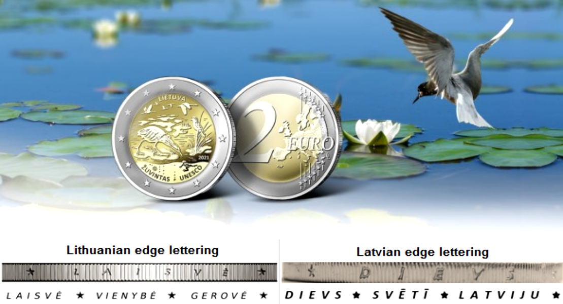 Банк Литвы информирует, что часть памятных монет 2 евро посвященная биосферному заповеднику Жувинтас, была отчеканена в качестве BU с ошибкой в надписи на гурту. Вместо литовской надписи LAISVĖ * VIENYBĖ * GEROVĖ * по краю латышская надпись DIEVS * SVĒTĪ * LATVIJU.