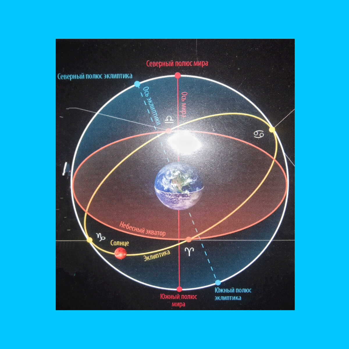 Ось мира-воображаемая линия, проходящая через центр мира, вокруг которого происходит вращение небесной сферы. Вращение небесной сферы происходит против часовой стрелки вокруг северного полюса, если смотреть на небесную сферу изнутри. Рассмотрим все по порядку: Осеннее равноденствие(Весы)-23 сентября - точка, в которой эклиптика пересекается с небесным экватором, называется точкой равноденствия. В точке осеннего равноденствия Солнце в своем движении переходит из северного полушария в южное. Небесный экватор- большой круг небесной сферы, плоскость которого перпендикулярна оси мира и проходит через центр небесной сферы. Небесный экватор делит небесную сферу на два полушария: северное и южное. Зимнее солнцестояние (Козерог)-22 декабря - точка эклиптики,