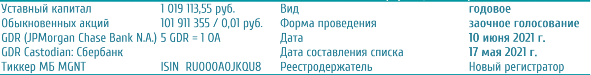 Один из лидеров российского розничного бизнеса ПАО Магнит проводит свое отчетное годовое собрание 10 июня 2021 в заочной форме: